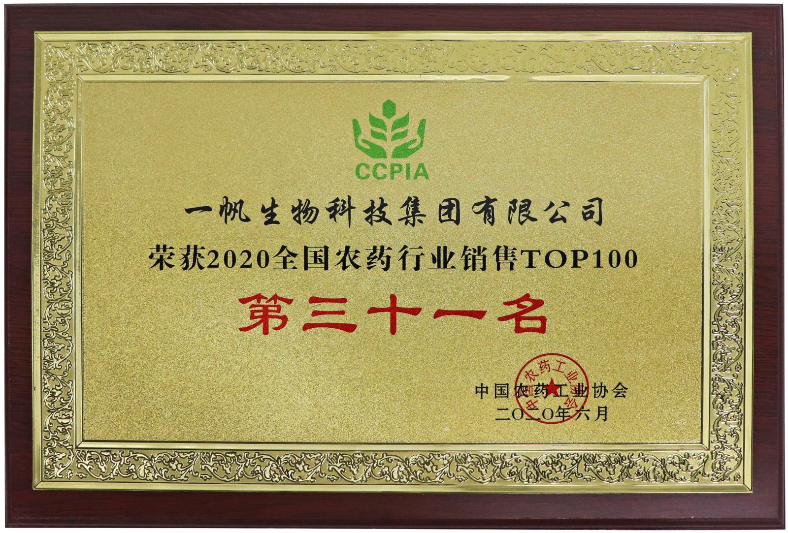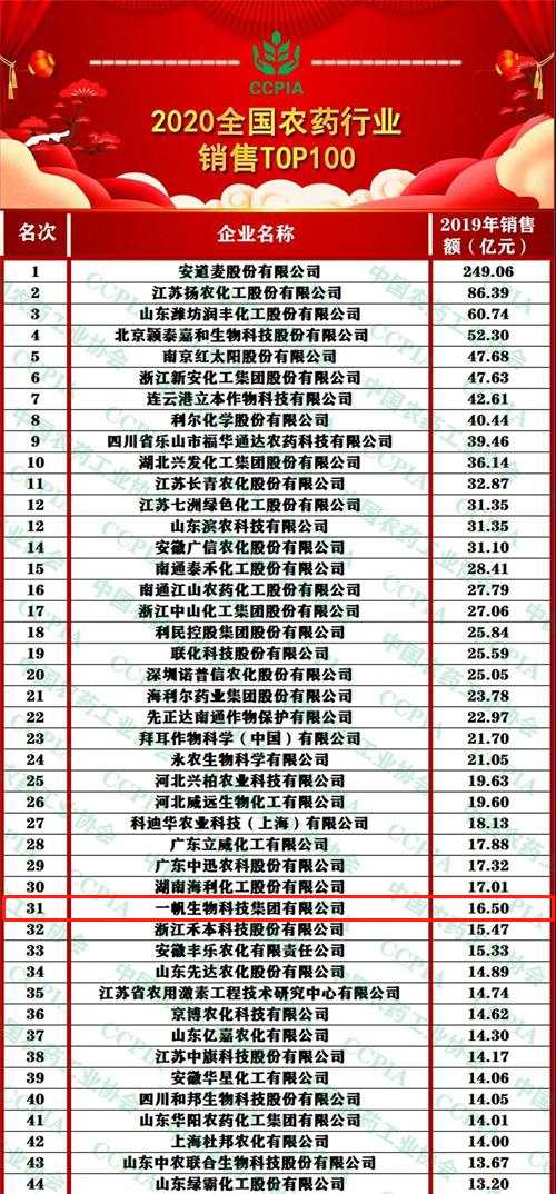 一帆生物榮列第31強! 2020全國農藥行業(yè)銷售TOP100發(fā)布 |