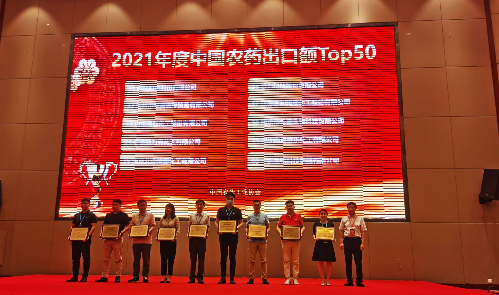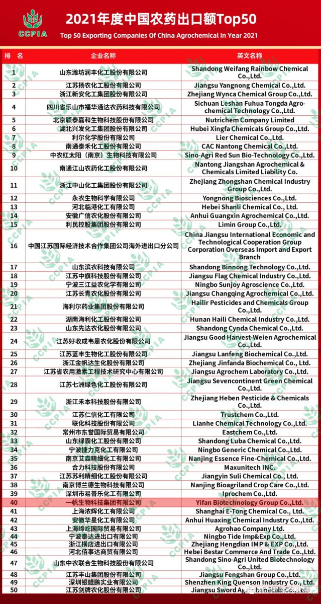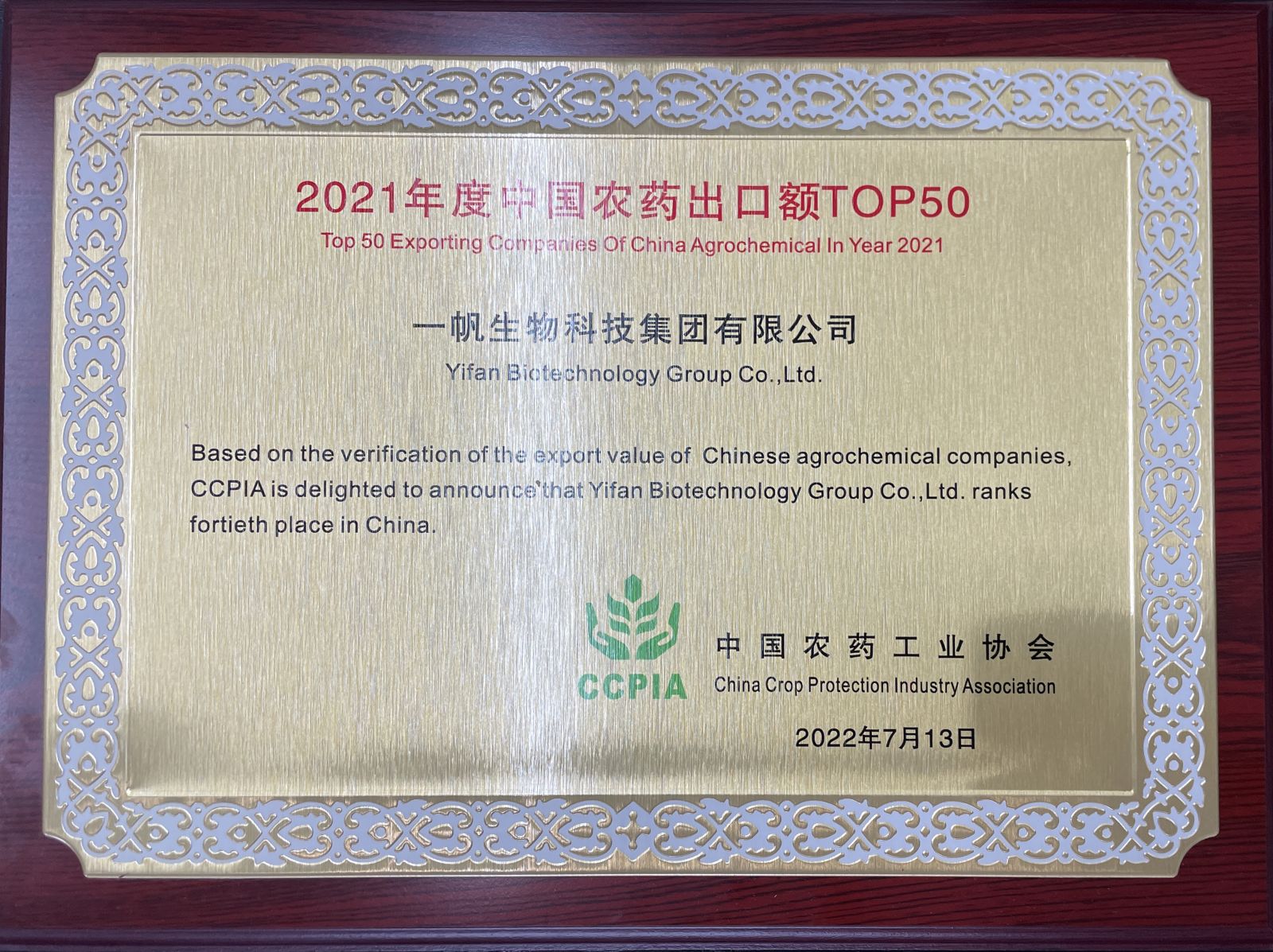 2022年7月13日,在“第九屆中國植物保護(hù)產(chǎn)品國際貿(mào)易發(fā)展論壇”上,中國農(nóng)藥工業(yè)協(xié)會國際貿(mào)易委員會發(fā)布2021年度“中國農(nóng)藥出口額Top 50”榜單,一帆生物榮列榜單第40位。
