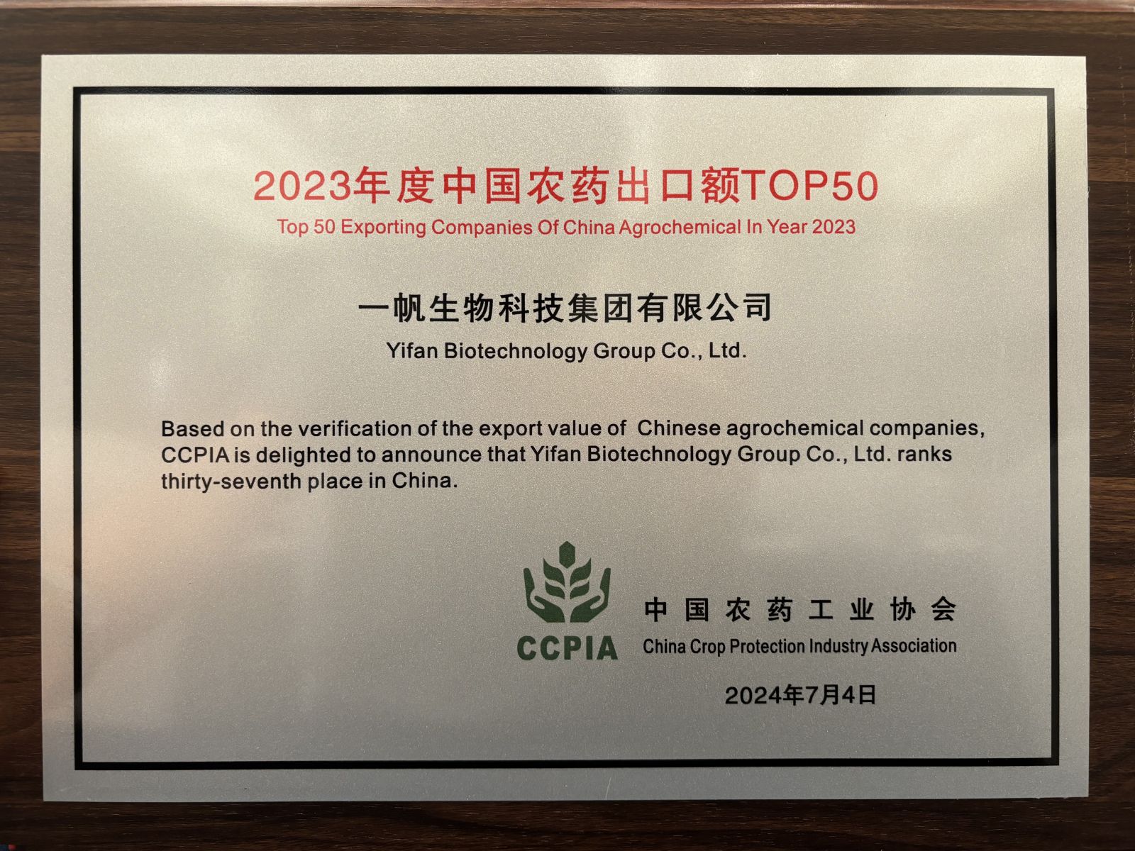 2024年7月4日,第十一屆中國植物保護產(chǎn)品國際貿(mào)易發(fā)展論壇在南京召開。論壇上, 中國農(nóng)藥工業(yè)協(xié)會發(fā)布2023年度“中國農(nóng)藥出口額Top50”,一帆生物榮登榜單,位列第37名。
