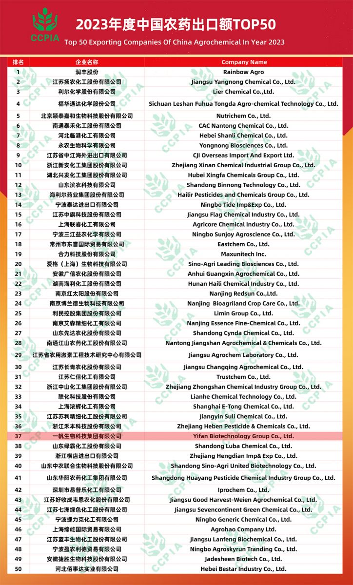 喜報!一帆榮登2023年度中國農(nóng)藥出口額TOP50榜單 |