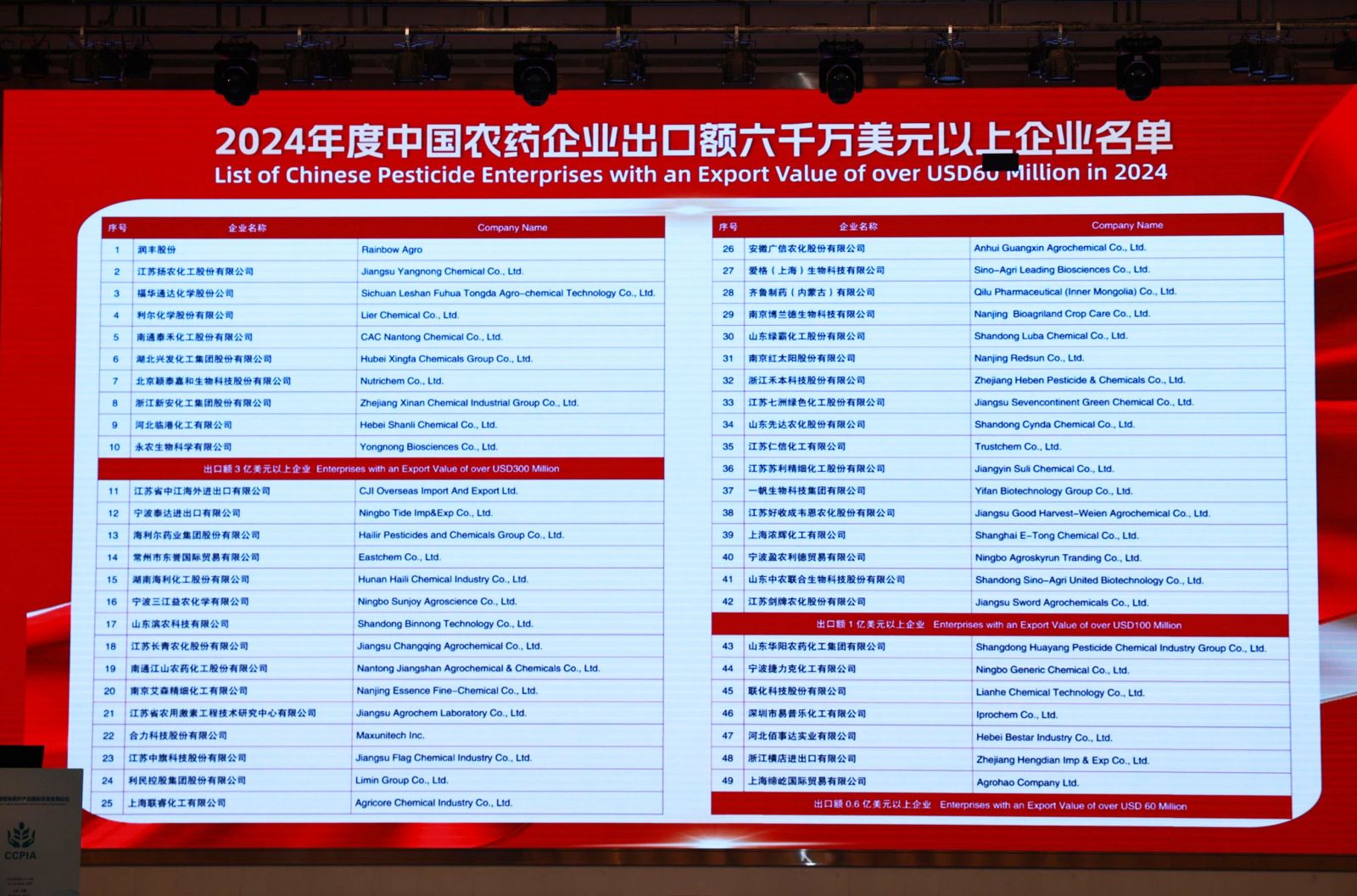 2025年6月12日,“第十二屆中國植物保護(hù)產(chǎn)品國際貿(mào)易發(fā)展論壇”于山東日照隆重召開。論壇期間,中國農(nóng)藥工業(yè)協(xié)會發(fā)布了2024年度中國農(nóng)藥企業(yè)出口額6000萬美元以上企業(yè)名單,一帆生物科技集團(tuán)有限公司榮登榜單第37位。